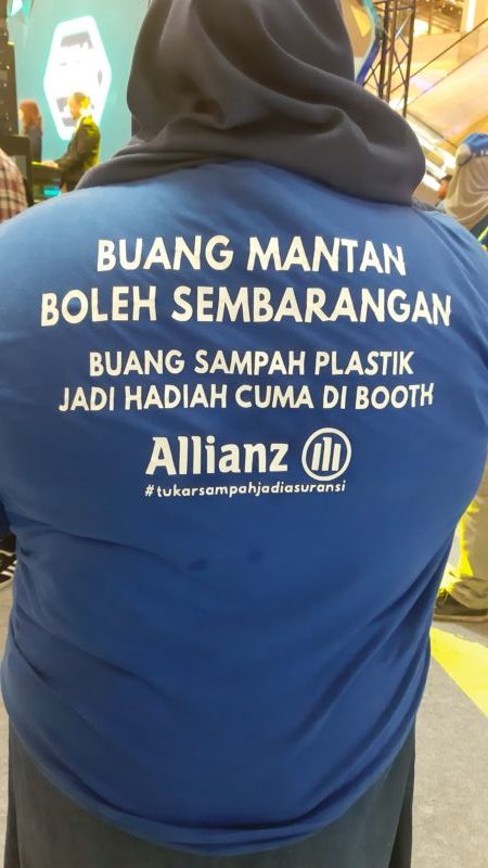Di Booth Allianz Indonesia kita bisa membawa dua botol plastik bekas air kemasan untuk ditukarkan asuransi perlindungan diri. Sampah plastik yang berhasil dikumpulkan di booth Allianz di acara ini akan dikoordinasikan dengan bank sampah setempat untuk dikelola agar bisa dipilah untuk didaur ulang.